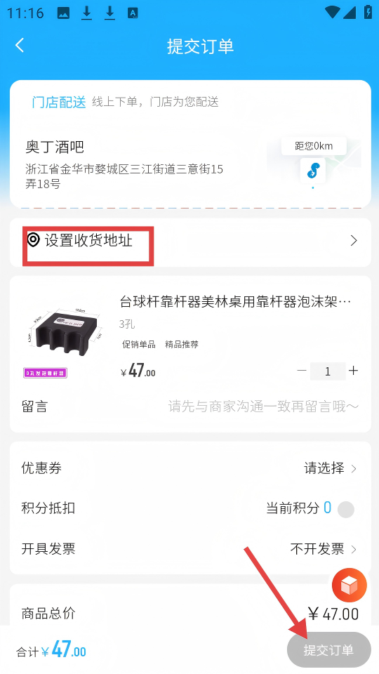 4、在提交订单页面,设置【收货地址】后,点击【提交订单】按钮,完成订单提交。