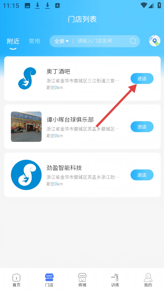 2、在门店列表中,点击【奥丁酒吧】右侧的【进店】按钮,进入店铺页面。