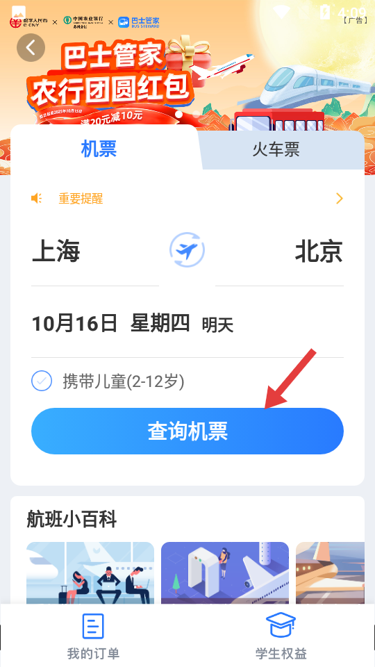 2、设置出发地、目的地、出行日期后点击【查询机票】。