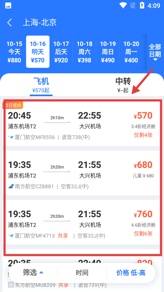 3、在航班列表中选择心仪的航班(可根据时间、价格、航空公司等筛选)。