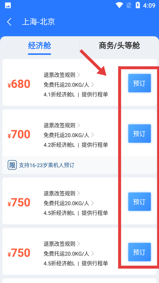 4、进入航班详情页,选择舱位类型(经济舱或商务/头等舱),点击【预订】,完成机票预订操作。