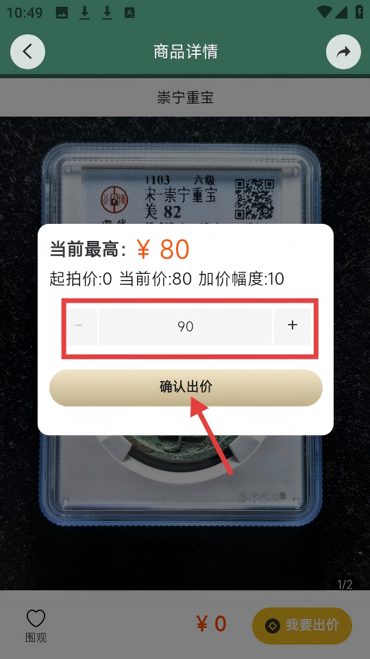 3、在出价窗口中,设置出价金额后,点击【确认出价】按钮。