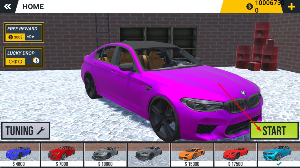 1、点击绿色【START】按钮,即可驾驶选中的紫色宝马汽车,开启游戏挑战。