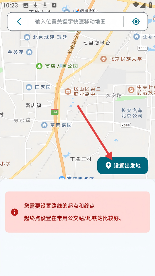 3、在地图页面,点击【设置出发地】,并按提示设置路线的起点和终点。
