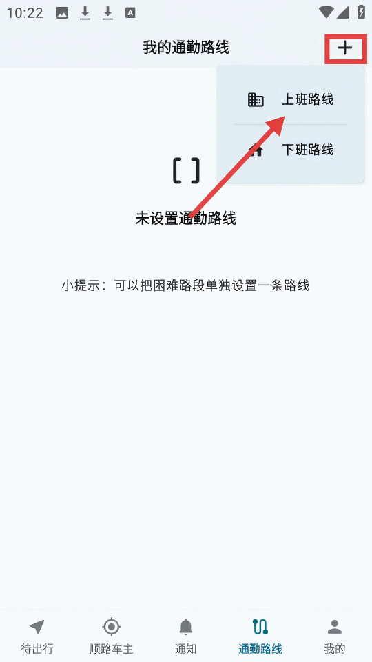2、在【我的通勤路线】页面,点击右上角【+】,选择【上班路线】。