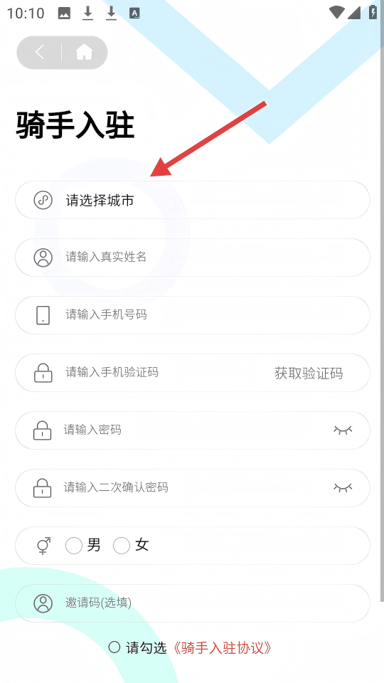 4、在【骑手入驻】页面,依次填写【请选择城市】【请输入真实姓名】等信息,勾选《骑手入驻协议》完成注册。