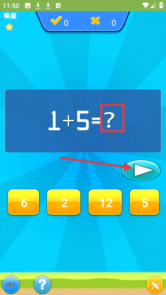 4、在数学题界面,算出【1+5=?】的结果后,点击右侧箭头按钮进行下一题。