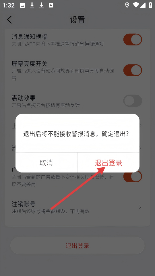 4、当弹出退出后将不能接收警报消息,确定退出?的提示框时,点击【退出登录】按钮即可退出。