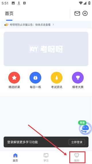1、在显示【精选好课】【每日一练】等功能的首页,找到底部导航栏的【我的】选项,点击进入对应页面以推进后续操作。