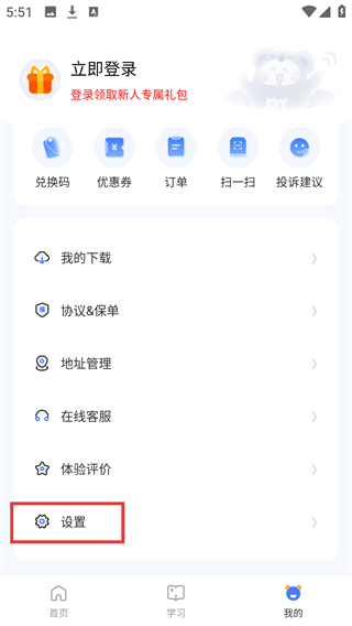 2、进入【我的】页面后,在功能列表里找到【设置】选项,点击该选项进入对应的设置界面开展后续操作。