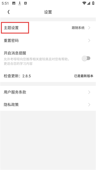 3、处于【设置】页面时,在功能选项中找到【主题设置】,点击该选项进入主题相关的设置界面。