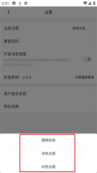 4、进入主题设置的弹窗后,可按需选择【跟随系统】【深色主题】【白色主题】中的选项,完成主题样式的切换。