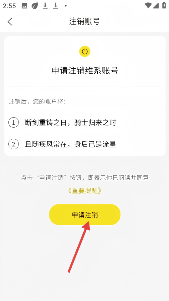 4、在【注销账号】页面,点击黄色的【申请注销】按钮,可申请注销维系账号。