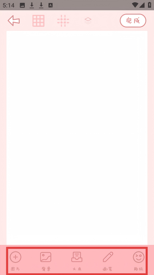 3、进入编辑页面后,可使用底部的【图片】【背景】【文本】【画笔】【贴纸】等工具进行手帐编辑。