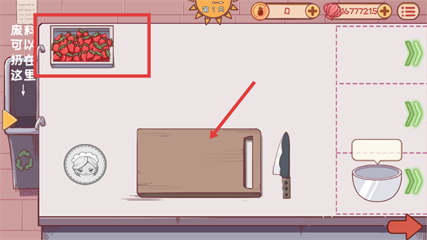 3、取【草莓】食材放置到【砧板】上,准备进行食材处理,为制作草莓汁做准备。