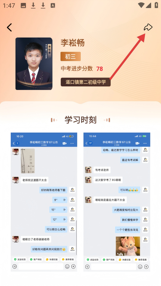 2、在本期提分喜讯页面,点击【李崧畅】的提分信息,进入其详情页面。