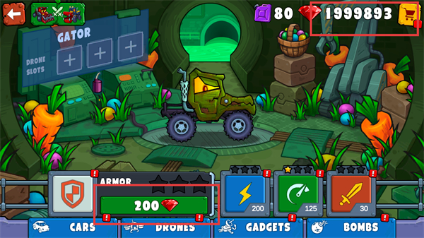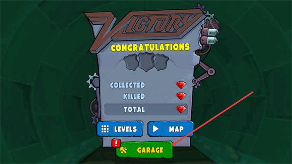 4、完成关卡后,点击【GARAGE】返回车库,利用收集的钻石和资源升级战车。