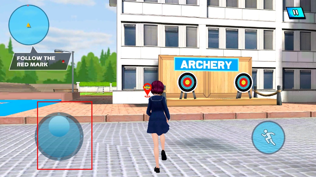 3、用左侧虚拟摇杆,操控角色移动,跟随红色标记,前往射箭等运动区域。