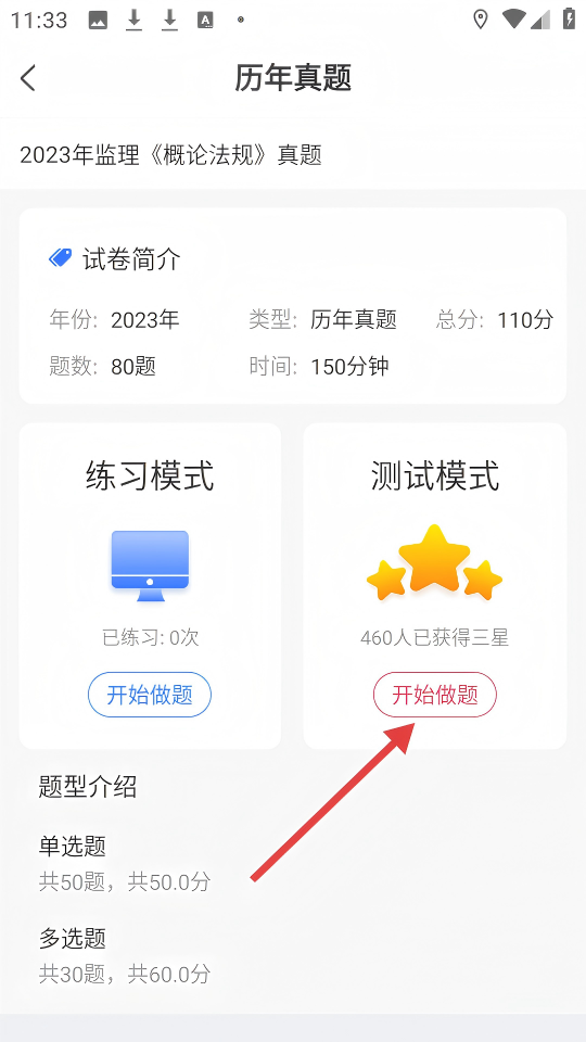 3、在2023年监理《概论法规》真题的模式选择页面,点击【测试模式】下的【开始做题】按钮,开始以测试模式做题。