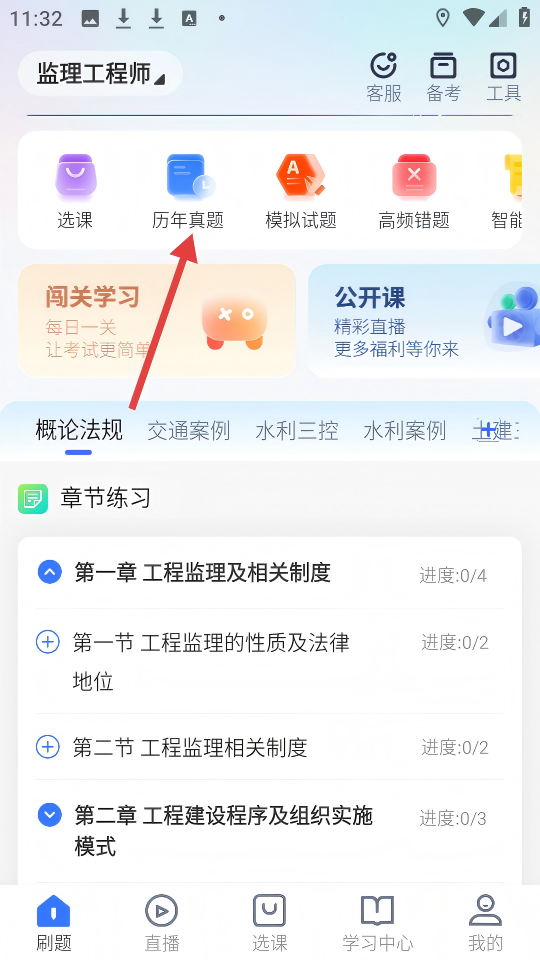 1、在监理工程师刷题页面,点击【历年真题】选项,进入历年真题界面。