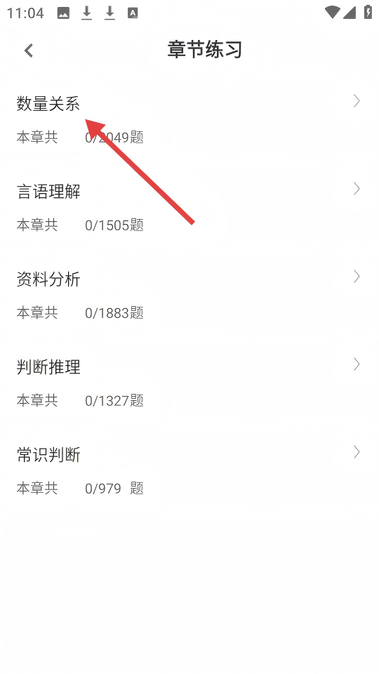 2、进入【章节练习】后,可选择【数量关系】【言语理解】等不同章节进行练习。