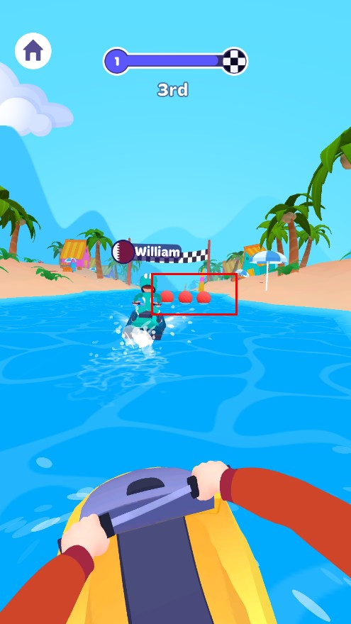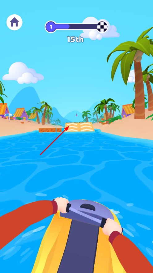 2、驾驶摩托艇,冲向黄色加速坡道,获取速度加成。