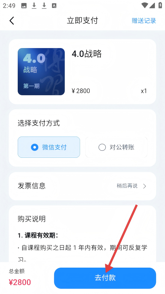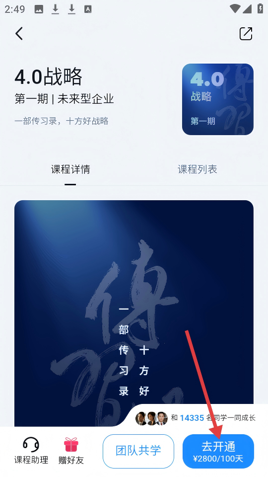 3、在课程详情页面,点击【去开通¥2800/100天】按钮,开通课程。