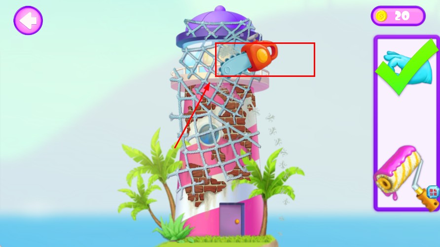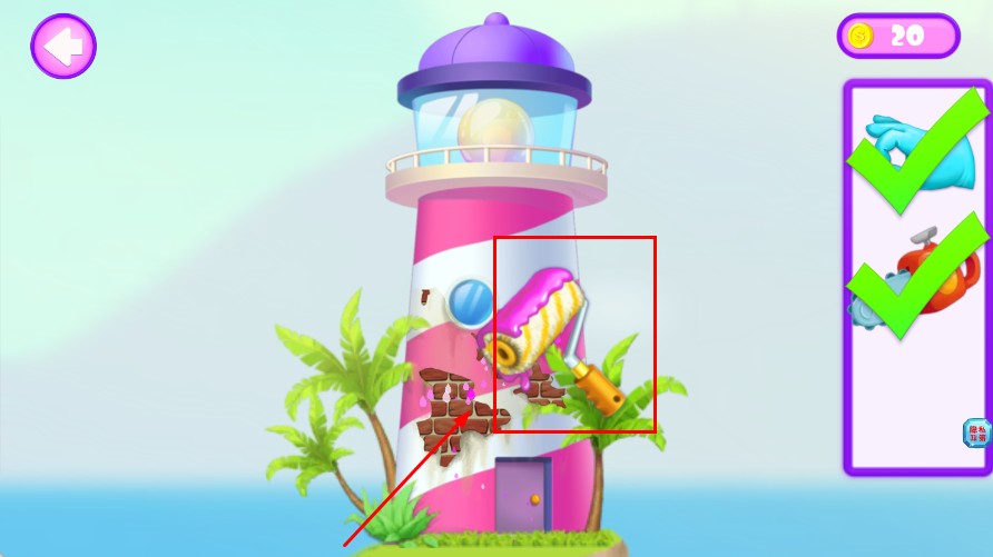 4、最后,用滚筒刷工具,对灯塔破损处进行粉刷等修复操作,完成灯塔修复。