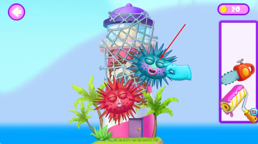 2、首先,清理灯塔上的蓝色海胆状物体,可通过手指弹开去除这些障碍物。