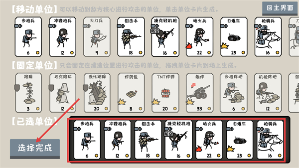 2、单位选择界面分移动单位和固定单位,选择完成后点击“选择完成”进入战斗,已选单位会作为初始兵力部署。