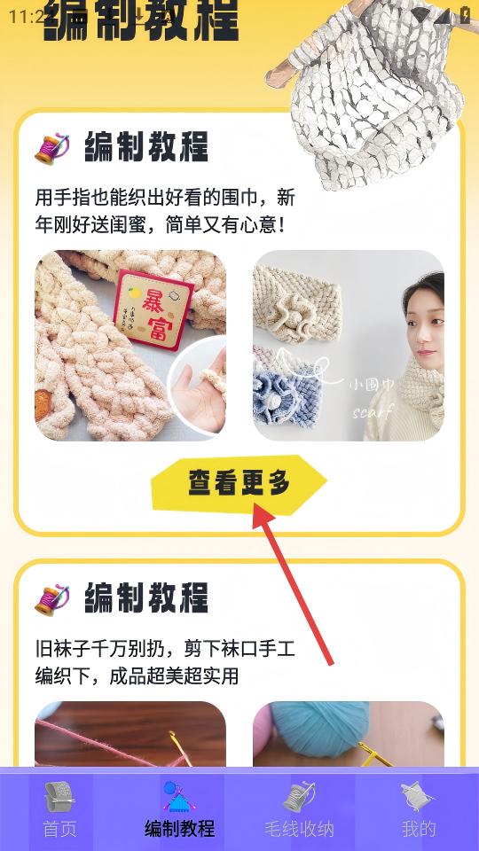 2、在【编制教程】页面,点击【用手指也能织出好看的围巾...】下方的【查看更多】。