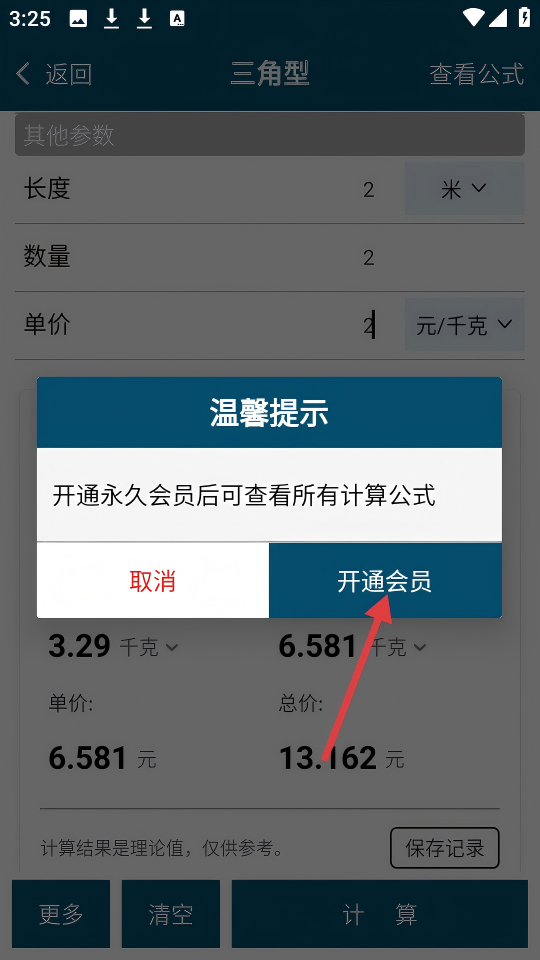 4、点击【查看公式】后,若弹出温馨提示弹窗,可根据需求点击【开通会员】以查看所有计算公式。