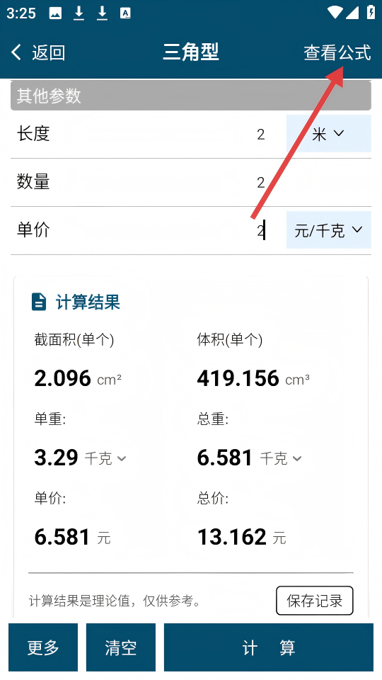 3、在三角型计算页面,点击右上角【查看公式】按钮,可查看计算公式。