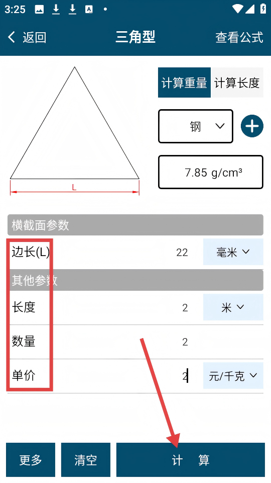 2、在三角型计算页面,设置【边长(L)】【长度】【数量】【单价】等参数后,点击【计算】按钮,获取计算结果。