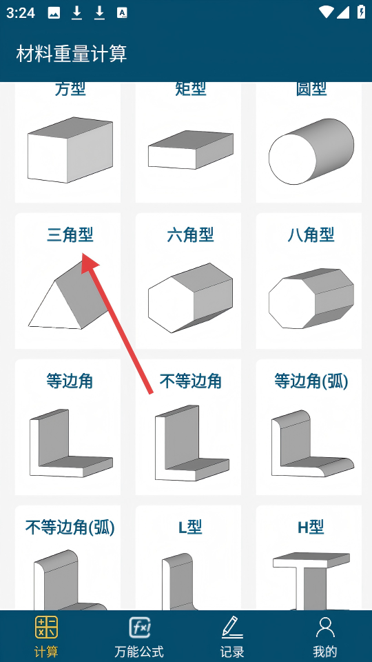 1、在材料重量计算页面,点击【三角型】选项,进入三角型计算页面。