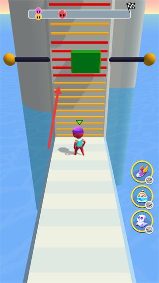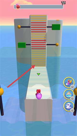 2、跟随绿色箭头提示向阶梯赛道前进,同时可拾取赛道中的【紫色道具】,助力后续闯关进程。