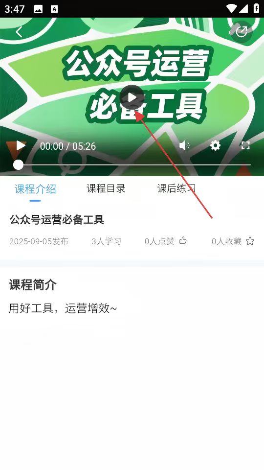 4、进入【公众号运营必备工具】课程页面后,点击视频上的播放按钮即可观看课程。