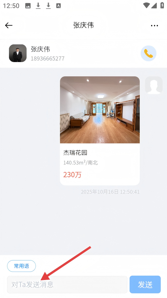 4、在与张庆伟的聊天页面,可在【对Ta发送消息】输入框输入内容,点击发送按钮,交流房源相关事宜。