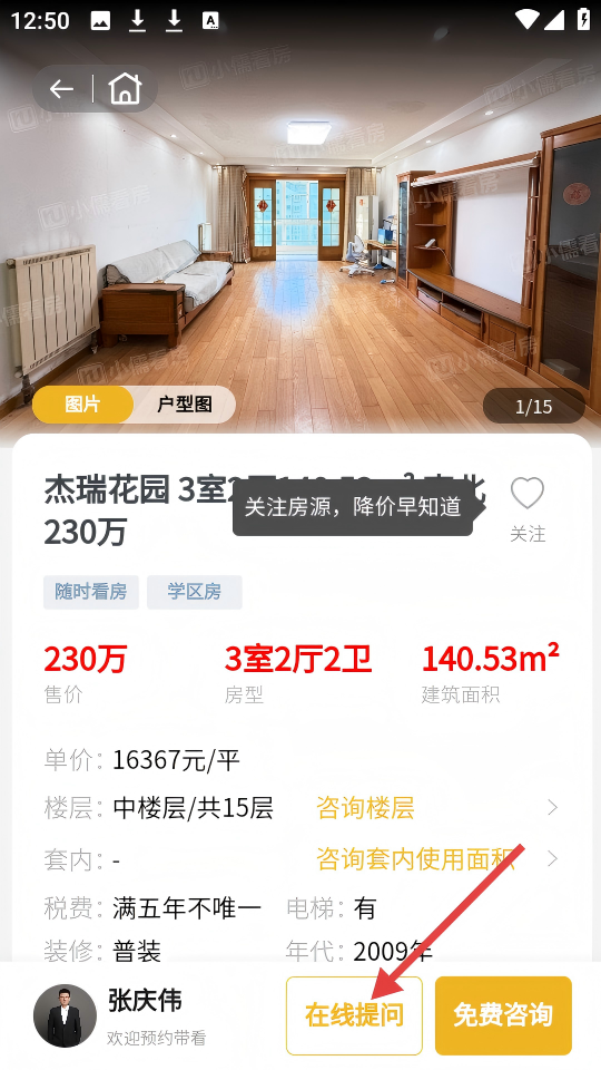 3、在杰瑞花园房源详情页,点击【在线提问】按钮,可向张庆伟提问房源相关问题。