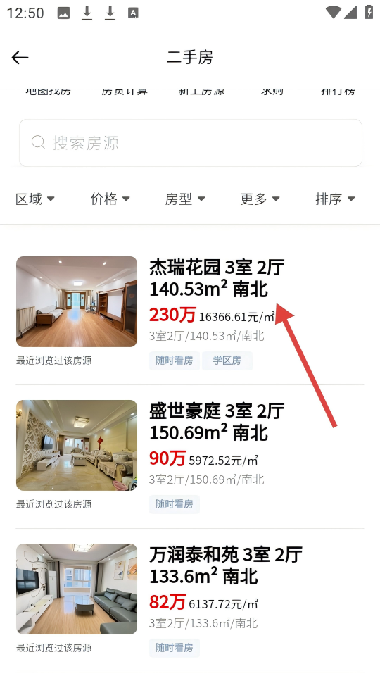 2、在二手房列表页面,点击【杰瑞花园3室2厅140.53㎡南北】的房源条目,进入该房源详情页。