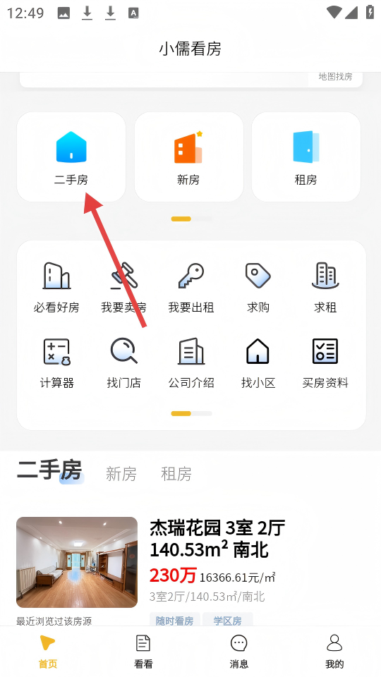 1、在小儒看房首页,点击【二手房】图标,进入二手房列表页面。
