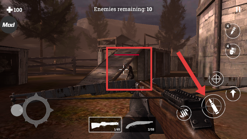 2、通过左侧方向控件移动角色,在场景中寻找僵尸,利用武器精准射击消灭敌人。