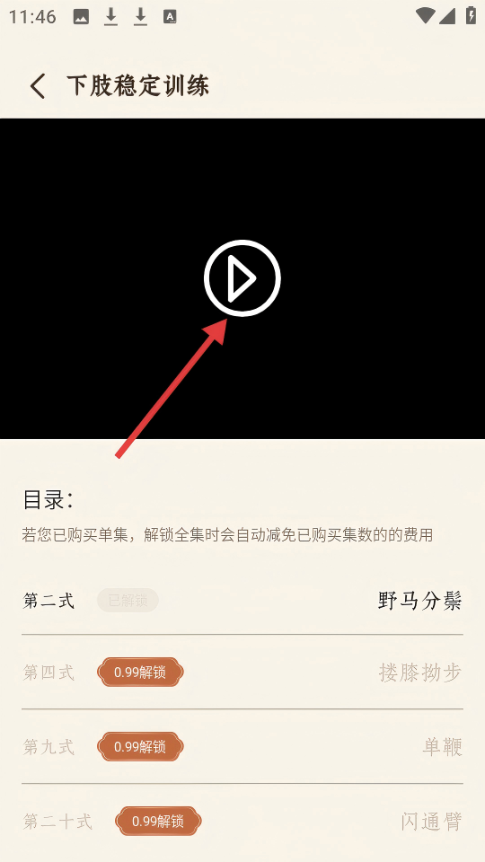 4、在【下肢稳定训练】课程页面,点击播放按钮,播放课程视频。