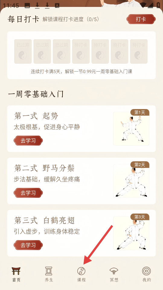 2、点击底部导航栏的【课程】按钮,进入课程页面查看课程内容。