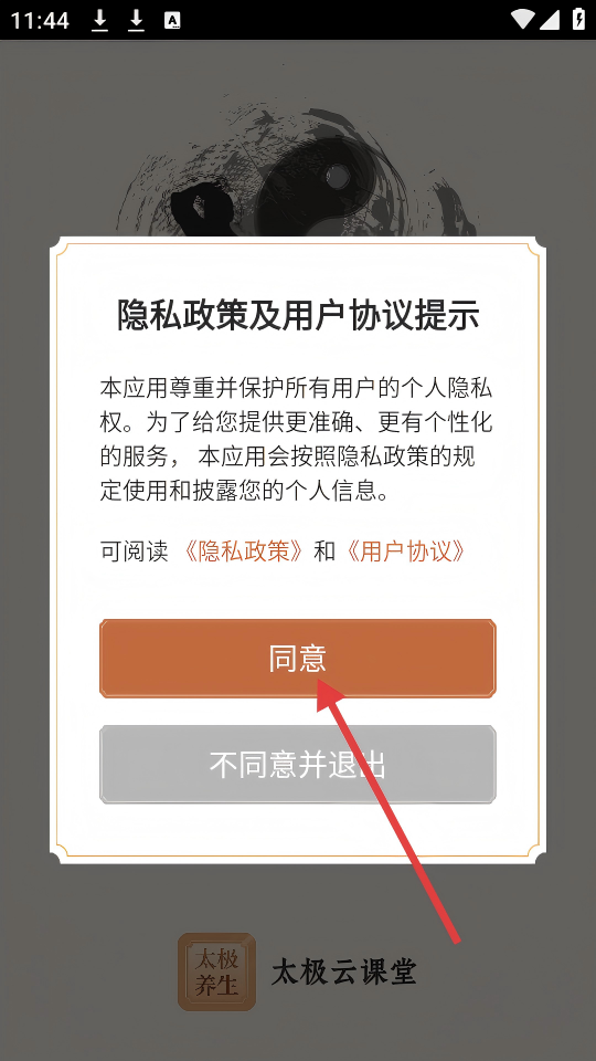 1、在弹出的【隐私政策及用户协议提示】窗口中,点击【同意】按钮,继续使用应用。