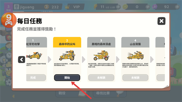 1、在每日任务界面,点击【開始】按钮,开启【森林中的尖叫】任务关卡。