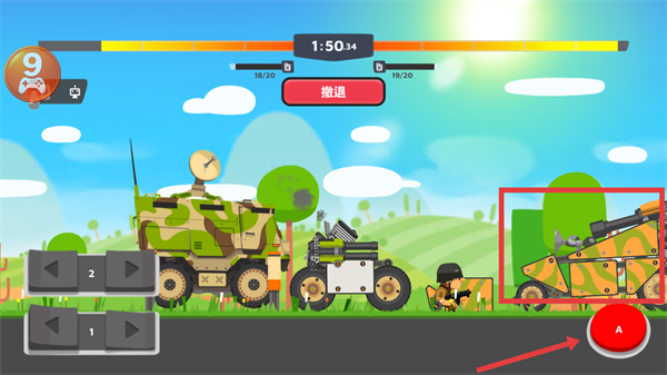 2、战斗中瞄准红色框内的敌方战车,点击红色【A】按钮发射攻击,打击敌方单位。