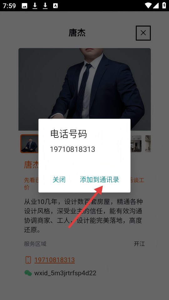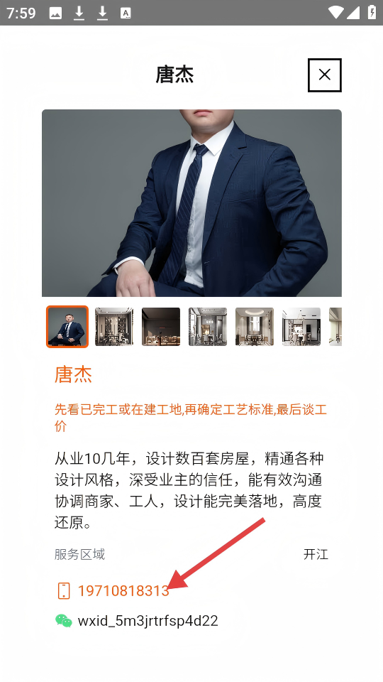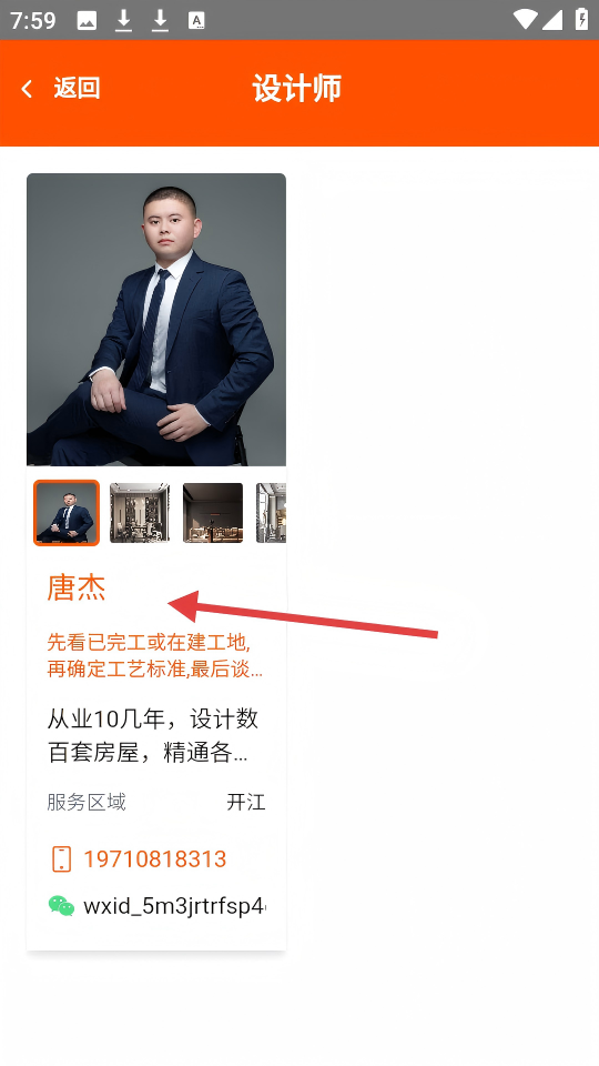 2、点击设计师【唐杰】的信息板块,查看其相关介绍。