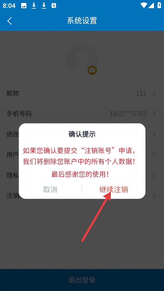 4、弹出【确认提示】弹窗后,点击【继续注销】按钮。