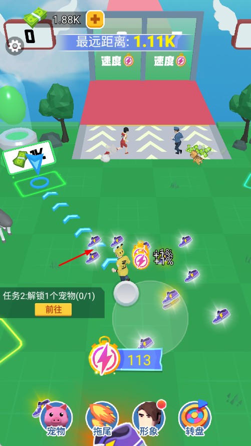 2、在游戏场景,收集紫色鞋子等道具,提升角色能力。